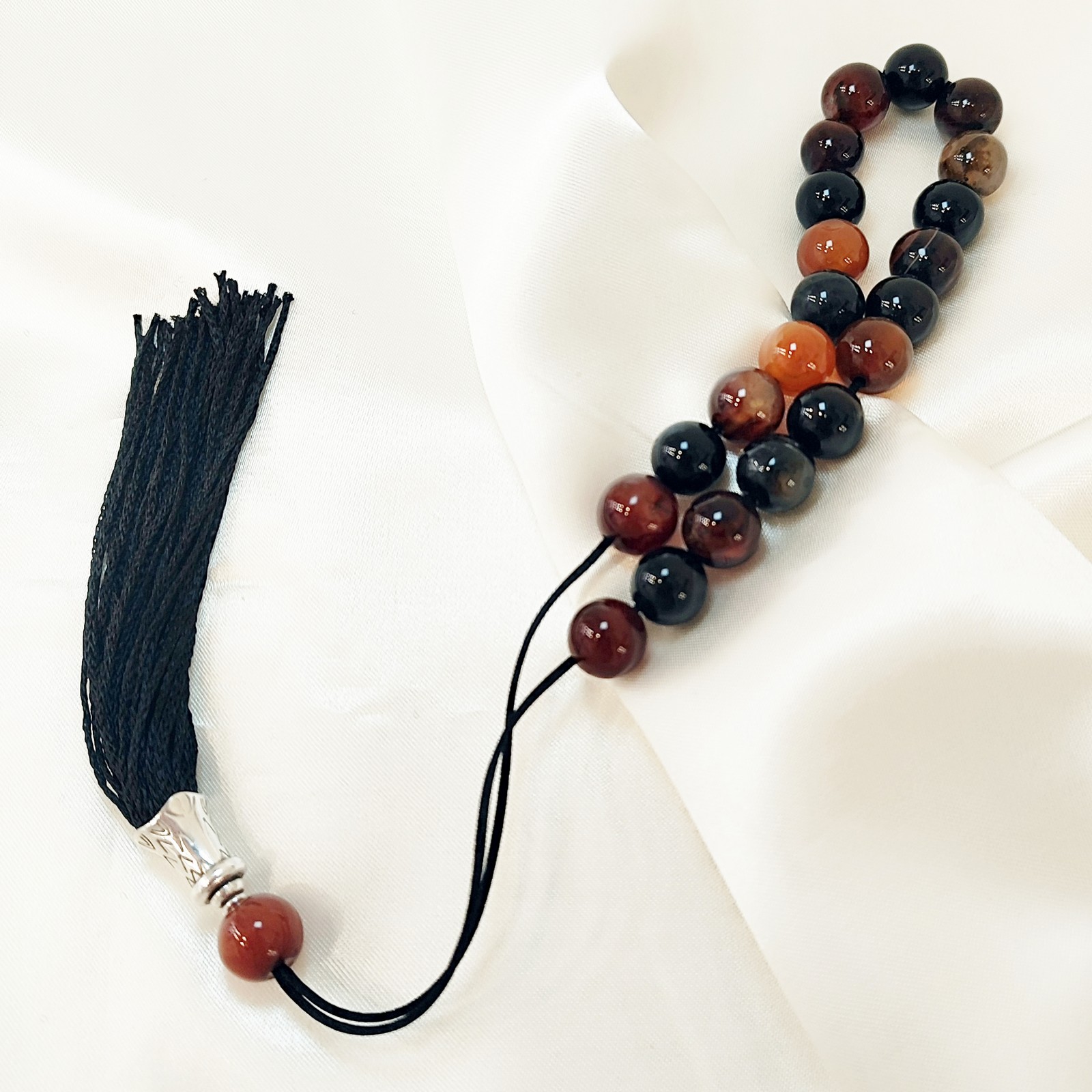 Κομπολόι από αχάτη αποτελούμενο από 21 χάντρες με κομψό δέσιμο. Επάργυρα στοιχεία και φούντα με μεταξωτό νήμα.