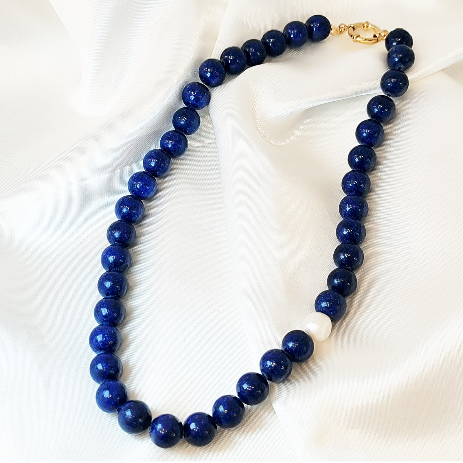 Κολιέ από ημιπολύτιμους λίθους λάπις λάζουλι, μαργαριτάρι και ατσάλινα στοιχεία.